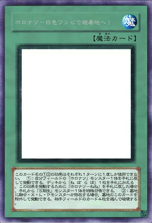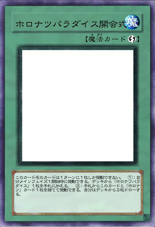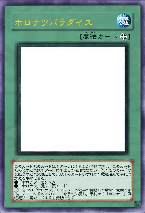このカード名のカードは1ターンに1枚しか発動できない。 ①:自分メインフェイズ1開始時に発動できる。デッキから「ホロナツパラダイス」1枚を手札に加える。 ②:手札からこのカードと「ホロナツ」カード1枚を捨てて発動できる。自分はデッキから2枚ドローする。 |