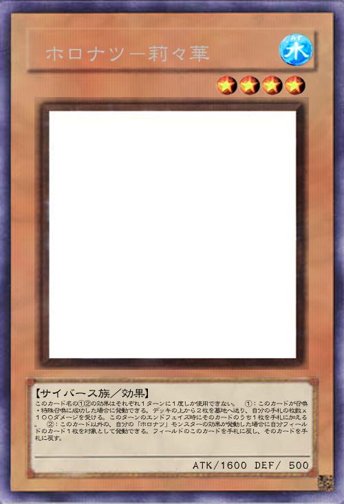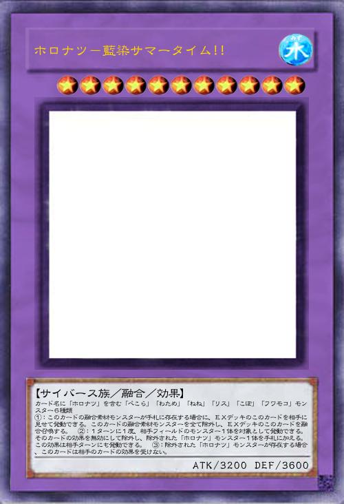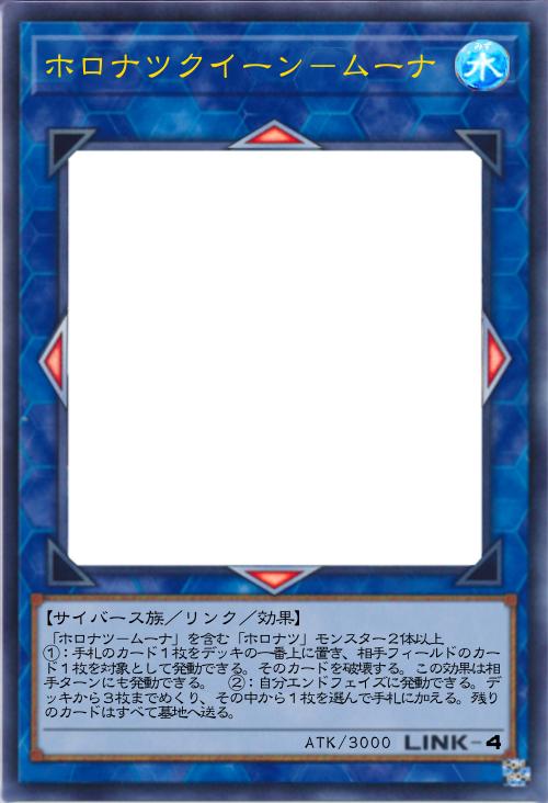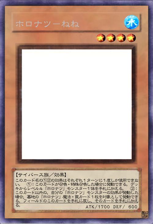 【サイバース族/効果】 このカード名の①③の効果はそれぞれ1ターンに1度しか使用できない。 ①:このカードが召喚・特殊召喚に成功した場合、手札2枚を捨てて発動できる。デッキからレベル3・4の「ホロナツ」モンスターを1体ずつ手札に加える。 ②:このカードがフィールドに存在する限り、自分はカウンター罠の効果を受けない。 ③:このカード以外の、自分の「ホロナツ」モンスターの効果が発動した場合に発動できる。フィールドのこのカードを手札に戻し、相手の手札をランダムで1枚選び墓地へ送る。 |