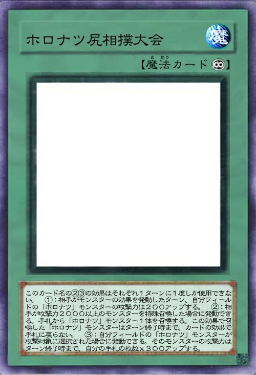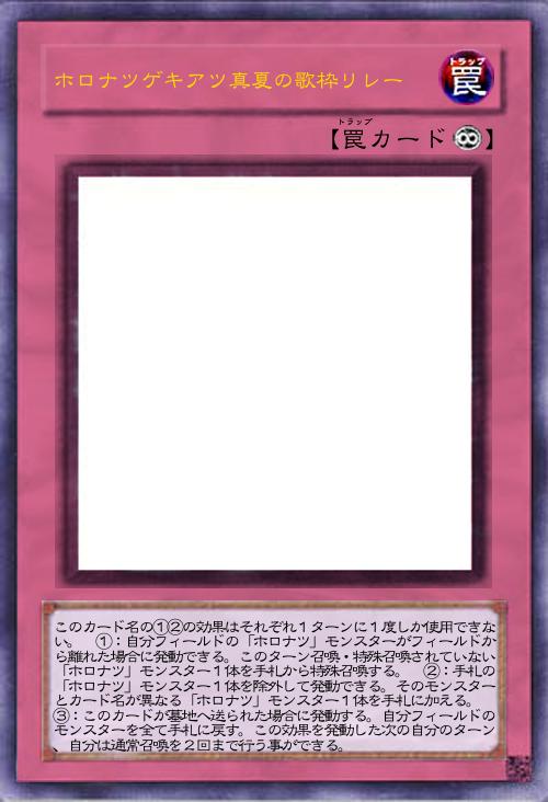 このカード名のカードは1ターンに1枚しか発動できず、このカード名の②の効果は1ターンに1度しか使用できない。①:このカードの発動時の効果処理として、以下のカードいずれか1枚を選んで手札に加える事ができる。 ●「ホロナツ」モンスター ●「ホロナツ」魔法・罠カード ②:自分の「ホロナツ」モンスターの効果が発動した場合に発動できる。フィールドのこのカードを手札に戻し、手札から「ホロナツ」永続魔法・罠カード1枚を発動できる。 |