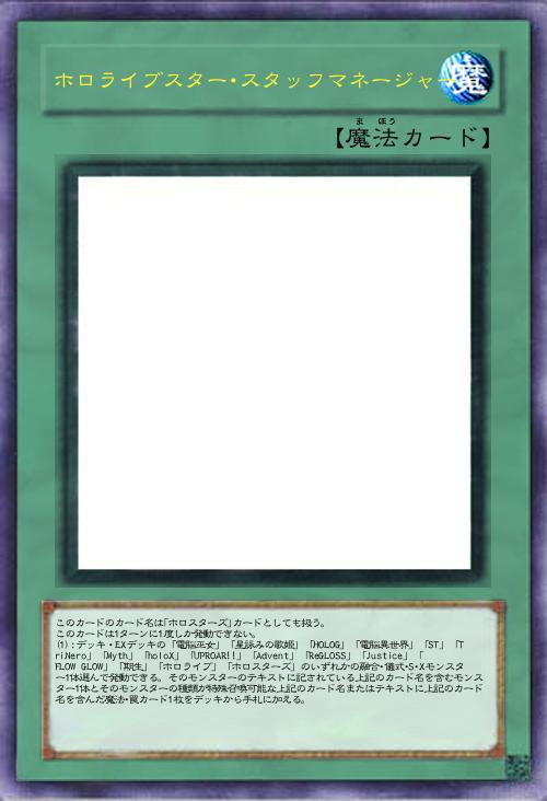 このカードの(1)(2)の効果は、それぞれ1ターンに1度しか発動できない。 このカードのカード名は「ホロスターズ」カードとしても扱う。 (1):自分のデッキ・墓地から「ホロライブ-友人A」「ホロスターズ-大道シノブ」「春先のどか」のいずれか1枚を手札に加える。 (2):自分メインフェイズに墓地のこのカードを除外し、「ホロライブスター・スタッフサポーター」以外の自分の墓地・除外状態の「電脳巫女」「星詠みの歌姫」「HOLOG」「電脳異世界」「ST」「TriNero」「Myth」「holoX」「UPROAR!!」「Advent」「ReGLOSS」「Justice」「FLOW GLOW」「期生」「ホロライブ」「ホロスターズ」魔法・罠カードのいずれか1枚を対象として発動できる。そのカードをデッキの一番下に戻す。その後、自分は1枚ドローする。 |