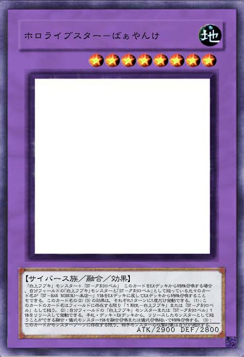 【サイバース族/融合/効果】 「白上フブキ」モンスター+「ST-夕刻ロベル」 このカードをEXデッキから特殊召喚する場合、自分フィールドの「白上フブキ」モンスターと「ST-夕刻ロベル」として扱っている元々のカード名が「ST-BAR ROBERU~来店~」1体をEXデッキに戻してEXデッキから特殊召喚することもできる。このカード名の(2)(3)の効果は、それぞれ1ターンに1度だけ発動できる。(1):このカードのカード名はフィールドに存在する限り「1期生-白上フブキ」または「ST-夕刻ロベル」として扱う。(2):自分フィールドの「白上フブキ」モンスターまたは「ST-夕刻ロベル」1体をリリースして発動できる。手札・デッキ・EXデッキから、リリースしたモンスターとして扱うことができる融合・儀式モンスター1体を融合召喚または儀式召喚扱いで特殊召喚する。(3):このカードがモンスターゾーンに存在する限り、相手モンスターの攻撃対象は自分が選択する。 |