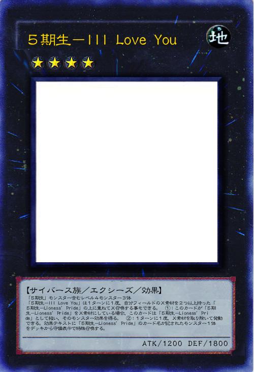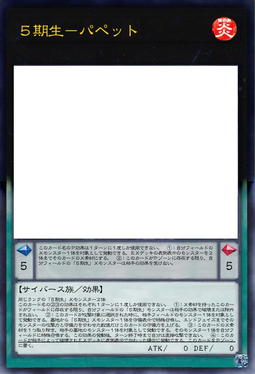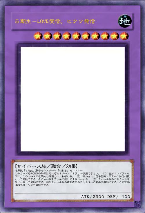 【昆虫族/融合/ペンデュラム/効果】 「KK」モンスター+効果モンスター2体 このカード名の①のモンスター効果は1ターンに1度しか使用できない。 ①:自分フィールドのカードが戦闘・効果で破壊された場合に発動できる。このカードをPゾーンに置く。その後、このターンに破壊されたモンスター1体を選び、その同名モンスター1体をデッキから手札に加える事ができる。この効果で効果テキストに「5期生」と記されたカードを手札に加えた場合、更に墓地から「ね ぽ ら ぼ」1枚を手札に加える。 このカード名ののP効果は1ターンに1度しか使用できない。 ①:自分メインフェイズに手札を1枚捨てて発動できる。Pゾーンのこのカードを特殊召喚する。 |