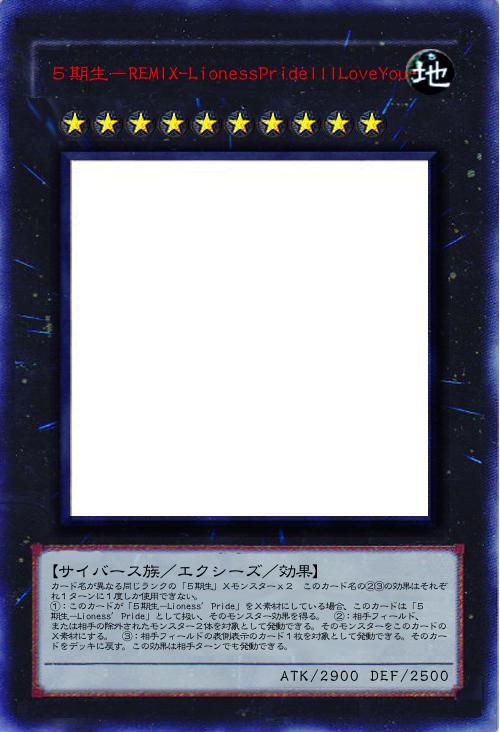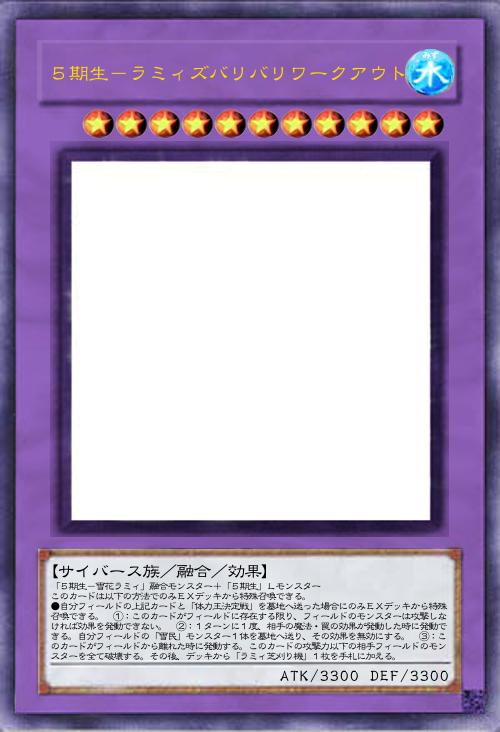 【サイバース族/融合/効果】 「5期生-桃鈴ねね」+効果モンスター3体 このカードは融合召喚でしか特殊召喚できない。 ①:このカードがモンスターゾーンに存在する限り、このカードは魔法・罠カードの効果を受けない。 ②:相手ターン中に相手が効果の発動、モンスターの召喚・特殊召喚を8回以上した場合発動できる。相手のターンを終了する。 ③:相手メインフェイズに1ターンに1度発動できる。相手のデッキの上からカードを5枚確認し、2枚まで除外して残りのカードを好きな順番でデッキの上に戻す。 |