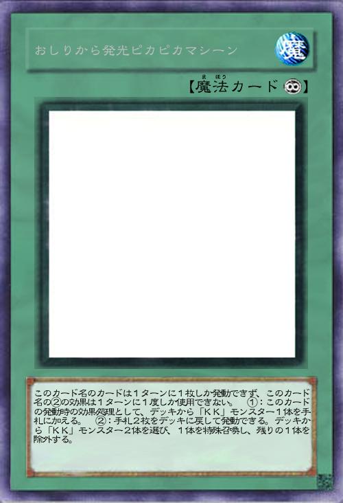 このカード名のカードは1ターンに1枚しか発動できず、このカード名の②の効果は1ターンに1度しか使用できない。 ①:このカードの発動時の効果処理として、デッキから「KK」モンスター1体を手札に加える。 ②:手札2枚をデッキに戻して発動できる。デッキから「KK」モンスター2体を選び、1体を特殊召喚し、残りの1体を除外する。 |