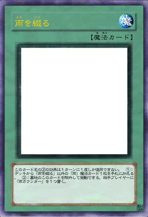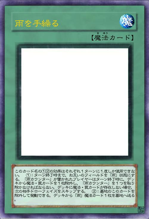 このカード名の①②の効果はそれぞれ1ターンに1度しか使用できない。 ①:ターン終了時まで、お互いのフィールドを「雨」状態にする。「雨カウンター」が置かれたプレイヤーはターン終了時に自分の手札1枚を墓地へ送り、「雨カウンター」を1つを取り除かなければならない。 ②:墓地のこのカードを除外して発動できる。相手プレイヤーに「雨カウンター」を1つ置く。 |