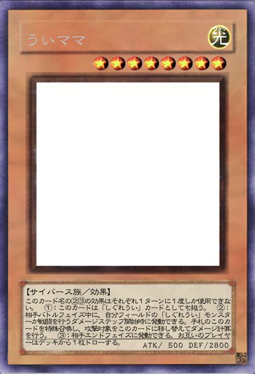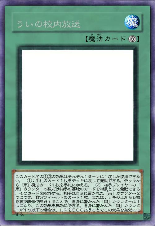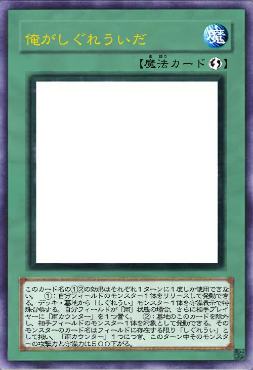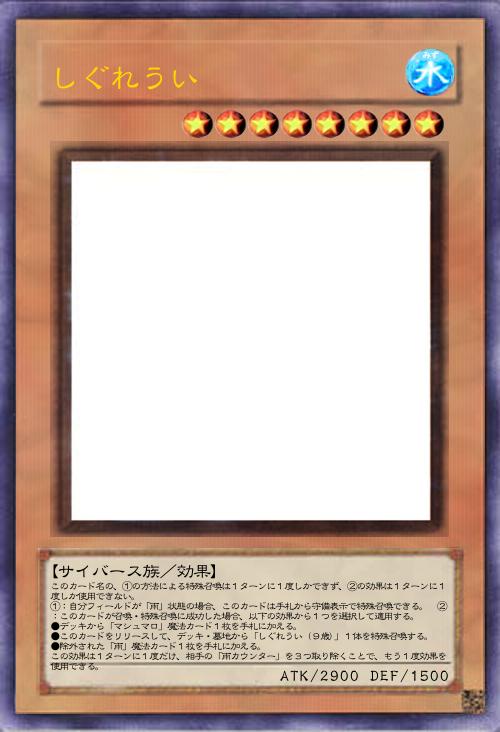 このカード名の①③の効果はそれぞれ1ターンに1度しか使用できない。 ①:相手フィールドの魔法・罠カード1枚を対象として発動できる。そのカードを破壊する。この効果を使用しなかったターンの自分エンドフェイズに、自分は1000ダメージを受ける。 ②:相手がフィールドのモンスターの効果を発動したターン、自分フィールドのモンスターの攻撃力は1000アップする。 ③:自分フィールドが「雨」状態の時に、自分フィールドの「しぐれうい」モンスター1体を対象として発動できる。このターンそのモンスターは、相手モンスターに100回まで攻撃できる。 |