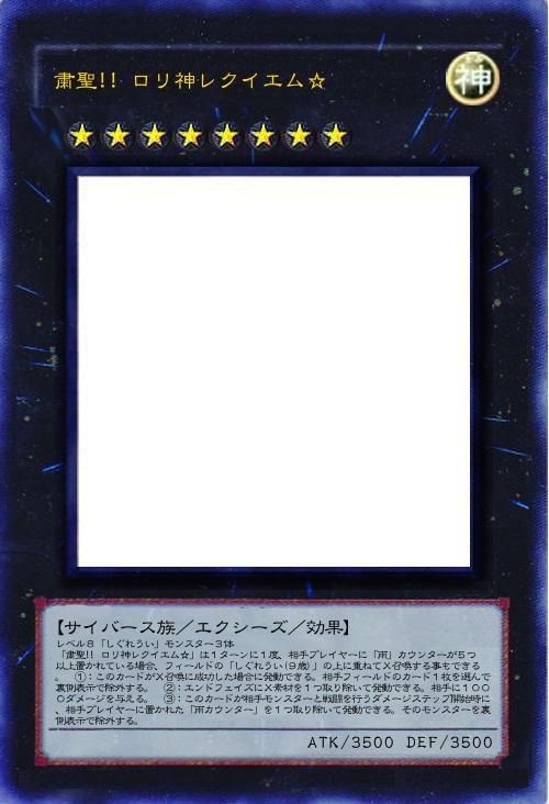 【サイバース族/エクシーズ/効果】 レベル8「しぐれうい」モンスター3体 「粛聖!! ロリ神レクイエム☆」は1ターンに1度、相手プレイヤーに「雨」カウンターが5つ以上置かれている場合、フィールドの「しぐれうい(9歳)」の上に重ねてX召喚する事もできる。 ①:このカードがX召喚に成功した場合に発動できる。相手フィールドのカード1枚を選んで裏側表示で除外する。 ②:エンドフェイズにX素材を1つ取り除いて発動できる。相手に1000ダメージを与える。 ③:このカードが相手モンスターと戦闘を行うダメージステップ開始時に、相手プレイヤーに置かれた「雨カウンター」を1つ取り除いて発動できる。そのモンスターを裏側表示で除外する。 |