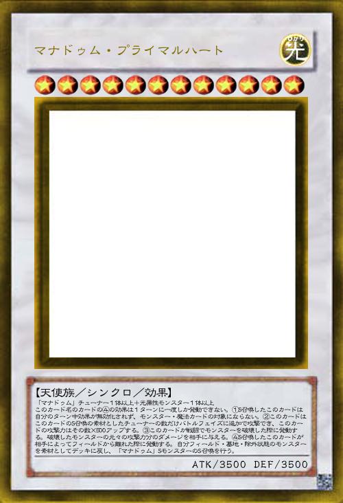 【天使族/シンクロ/効果】 チューナー1体以上+光属性モンスター1体 このカードはフィールドに1体しか表側表示で存在できない。 ①このカードは相手の効果の対象にならない。このカードが「マナドゥム・プライムハート」をS素材としている場合、このカードは相手が発動した効果を受けない。②1ターンに1度、自分の墓地からチューナーモンスター1体を除外し、フィールドのカード1枚を対象として発動できる。そのカードを破壊する。この効果は相手ターンでも発動できる。③このカードが相手によってフィールドから離れた場合に自分の墓地から「マナドゥム・プライムハート」1体を対象として発動できる。そのカードを特殊召喚する。このターン、そのモンスターは相手の発動した効果を受けず、全ての相手のモンスターに1回ずつ攻撃できる。 |