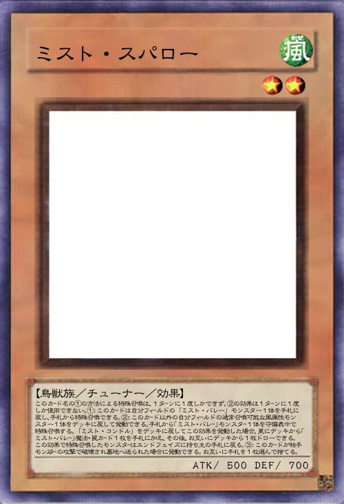 【鳥獣族/チューナー/効果】 このカード名の①の方法による特殊召喚は、1ターンに1度しかできず、②の効果は1ターンに1度しか使用できない。①:このカードは自分フィールドの「ミスト・バレー」モンスター1体を手札に戻し、手札から特殊召喚できる。②:このカード以外の自分フィールドの通常召喚可能な風属性モンスター1体をデッキに戻して発動できる。手札から「ミスト・バレー」モンスター1体を守備表示で特殊召喚する。「ミスト・コンドル」をデッキに戻してこの効果を発動した場合、更にデッキから「ミスト・バレー」魔法・罠カード1枚を手札に加え、その後、お互いにデッキから1枚ドローできる。この効果で特殊召喚したモンスターはエンドフェイズに持ち主の手札に戻る。③:このカードが相手モンスターの攻撃で破壊され墓地へ送られた場合に発動できる。お互いに手札を1枚選んで捨てる。 |