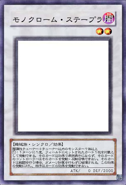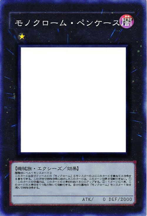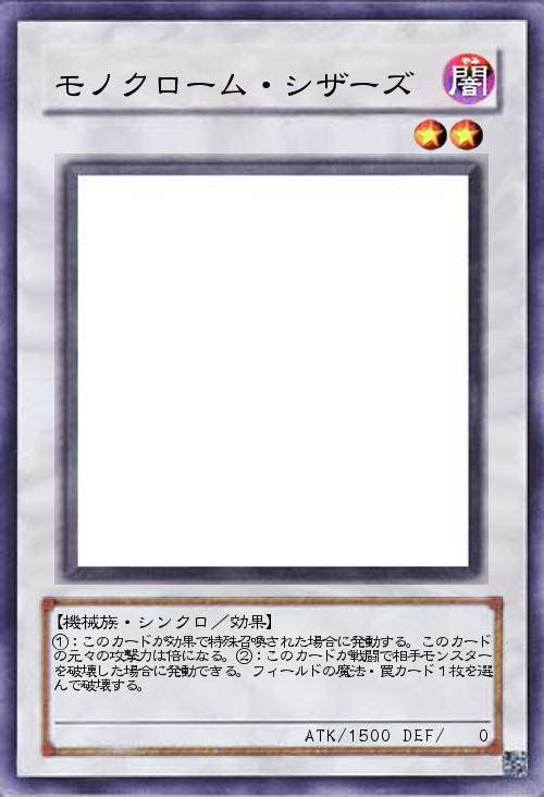 【機械族・エクシーズ/効果】 闇属性レベル1モンスター×2〇このカードは自分フィールドの「モノクローム」Sモンスターの上にこのカードを重ねてX召喚する事もできる。この方法で特殊召喚に成功したこのカードは、このターン効果を発動できない。①:このカードの守備力は、このカードのX素材の数×500アップする。②:1ターンに1度、このカードのX素材を1つ取り除いて発動できる。自分の墓地の「モノクローム」モンスター1体を選んで特殊召喚する。 |