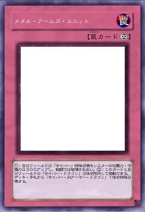 ①:自分フィールドの「サイバー」機械族モンスターを対象とした効果を相手が発動した場合に発動できる。その効果を無効にし破壊する。その後、「ダイアモンド・アームズ・ユニット」以外の「アームズ・ユニット」魔法・罠カードの効果で特殊召喚されたモンスター1体と「サイバー・ドラゴン」3体を自分の手札・フィールドから墓地に送る事で、デッキ・手札・墓地から「サイバー・Dアーマー・ドラゴン」1体を特殊召喚する。 |