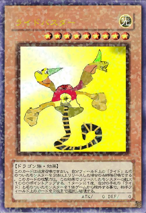 【ドラゴン族・効果】 このカードは通常召喚できない。自分フィールド上の「ライド」と名のついたモンスターを3体以上リリースした場合のみ特殊召喚できる。このカードの攻撃力は、この効果でリリースしたモンスターの数X1000ポイントアップする。1ターンに1度、自分の手札の「ライド」と名のついたモンスターを1体ゲームから除外する事で、相手フィールド上のカードを2枚まで選択し破壊する。 |