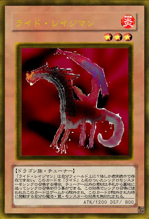 【ドラゴン族・チューナー】 「ライド・レイジマン」は自分フィールド上に1体しか表側表示で存在できない。このカードを「ライド」と名のついたシンクロモンスターをシンクロ召喚する場合、チューナー以外の素材は手札から墓地に送ってシンクロ召喚を行う事ができる。この効果でシンクロ召喚に使われたこのカードはゲームから除外され、このカードが除外された時に発動する自分の魔法・罠・モンスターの効果も無効化される。 |