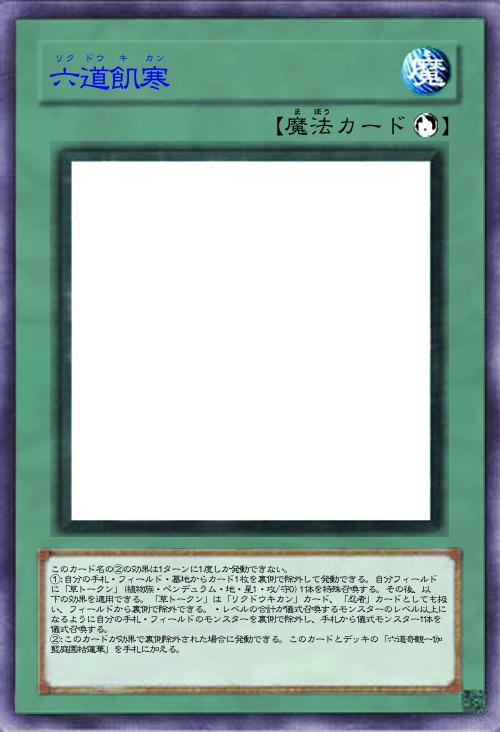 【植物族/儀式/効果】 「六道飢寒」により降臨。このカードは墓地からの特殊召喚はできない。このカード名の①②③の効果はそれぞれ1ターンに1度しか発動できない。①:相手がモンスターを特殊召喚する際に発動できる。その特殊召喚を無効にし、そのモンスターを裏側で除外する。その後、自分フィールドの「リクドウキカン」カード1枚を裏側で除外する。②:魔法・罠カードの効果が発動した時に発動できる。その効果を無効にし裏側で除外する。その後、自分フィールドの「リクドウキカン」カード1枚を裏側で除外する。③:カードが裏側で除外された場合に発動できる。自分・相手の手札・墓地・フィールドのカード1枚を選んで裏側で除外する(相手の手札からはランダムに選ぶ)。④:このカードが除外・裏側除外された場合発動できる。このカードを手札に加える。このカードがフィールドから効果で裏側除外されている場合、1ターンに1度だけフィールドに戻す事もできる。 |