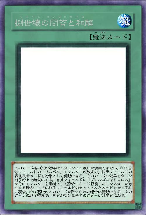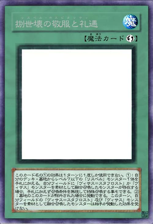 このカード名の②③の効果はそれぞれ1ターンに1度しか使用できない。①:自分フィールドの、「リスペル」モンスター、「ヴィサス」モンスター、「ヴィサス=スタフロスト」を素材として融合召喚したモンスターは、自分ターンの間、相手モンスターの効果を受けない。②:以下の効果から1つを選択して発動できる。●デッキから「リスペル」魔法カード1枚を墓地へ送る。●自分の除外状態の「リスペル」魔法カード1枚を手札に加える。③:魔法&罠ゾーンの表側表示のこのカードが墓地へ送られた場合、自分フィールドに「リスペル」モンスターが存在していれば発動できる。自分は2枚ドローする。 |