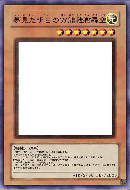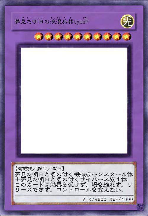 【機械族/融合/効果】 夢見た明日と名の付く機械族モンスター4体+夢見た明日と名の付くサイバース族1体 このカードは効果を受けず、場を離れず、リリースできず、コントロールを奪えない。 |