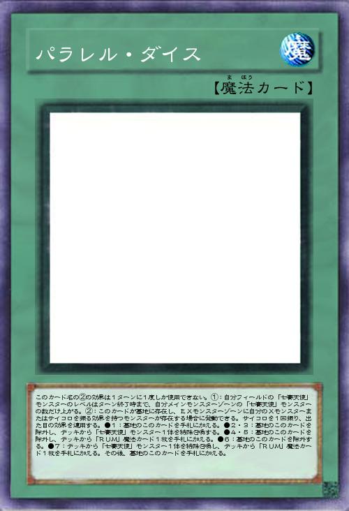 このカード名の②の効果は1ターンに1度しか使用できない。①:自分フィールドの「七賽天使」モンスターのレベルはターン終了時まで、自分メインモンスターゾーンの「七賽天使」モンスターの数だけ上がる。②:このカードが墓地に存在し、EXモンスターゾーンに自分のXモンスターまたはサイコロを振る効果を持つモンスターが存在する場合に発動できる。サイコロを1回振り、出た目の効果を適用する。●1:墓地のこのカードを手札に加える。●2・3:墓地のこのカードを除外し、デッキから「七賽天使」モンスター1体を特殊召喚する。●4・5:墓地のこのカードを除外し、デッキから「RUM」魔法カード1枚を手札に加える。●6:墓地のこのカードを除外する。●7:デッキから「七賽天使」モンスター1体を特殊召喚し、デッキから「RUM」魔法カード1枚を手札に加える。その後、墓地のこのカードを手札に加える。 |