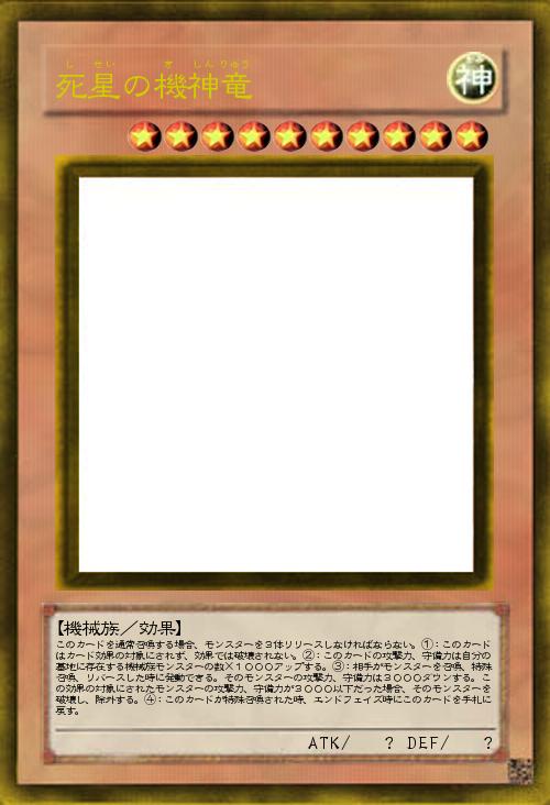 【機械族/効果】 このカードを通常召喚する場合、モンスターを3体リリースしなければならない。①:このカードはカード効果の対象にされず、効果では破壊されない。②:このカードの攻撃力、守備力は自分の墓地に存在する機械族モンスターの数×1000アップする。③:相手がモンスターを召喚、特殊召喚、リバースした時に発動できる。そのモンスターの攻撃力、守備力は3000ダウンする。この効果の対象にされたモンスターの攻撃力、守備力が3000以下だった場合、そのモンスターを破壊し、除外する。④:このカードが特殊召喚された時、エンドフェイズ時にこのカードを手札に戻す。 |