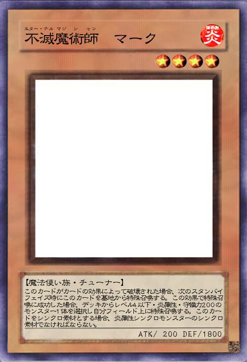 【魔法使い族・チューナー】 このカードがカードの効果によって破壊された場合、次のスタンバイフェイズ時にこのカードを墓地から特殊召喚する。この効果で特殊召喚に成功した場合、デッキからレベル4以下・炎属性・守備力200のモンスター1体を選択し自分フィールド上に特殊召喚する。このカードをシンクロ素材とする場合、炎属性シンクロモンスターのシンクロ素材でなければならない。 |