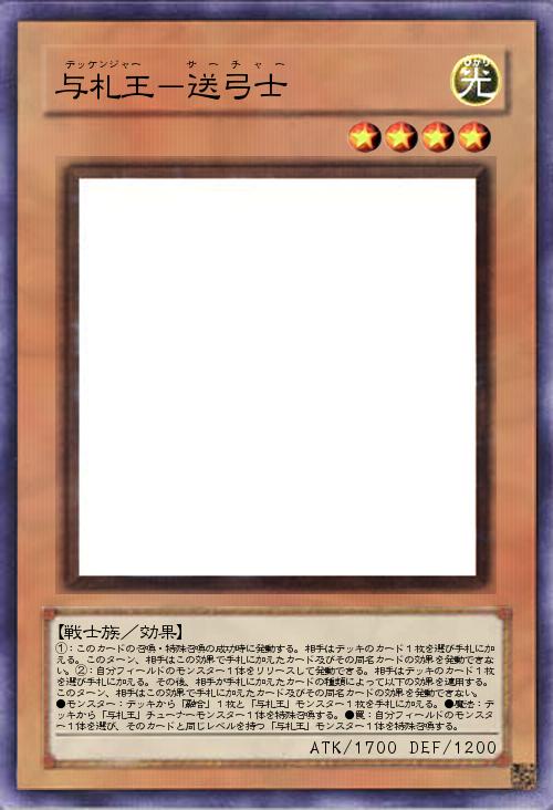 【戦士族/効果】 ①:このカードの召喚・特殊召喚の成功時に発動する。相手はデッキのカード1枚を選び手札に加える。このターン、相手はこの効果で手札に加えたカード及びその同名カードの効果を発動できない。②:自分フィールドのモンスター1体をリリースして発動できる。相手はデッキのカード1枚を選び手札に加える。その後、相手が手札に加えたカードの種類によって以下の効果を適用する。このターン、相手はこの効果で手札に加えたカード及びその同名カードの効果を発動できない。 ●モンスター:デッキから「融合」1枚と「与札王」モンスター1枚を手札に加える。●魔法:デッキから「与札王」チューナーモンスター1体を特殊召喚する。●罠:自分フィールドのモンスター1体を選び、そのカードと同じレベルを持つ「与札王」モンスター1体を特殊召喚する。 |