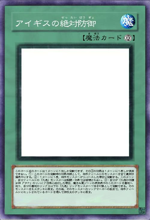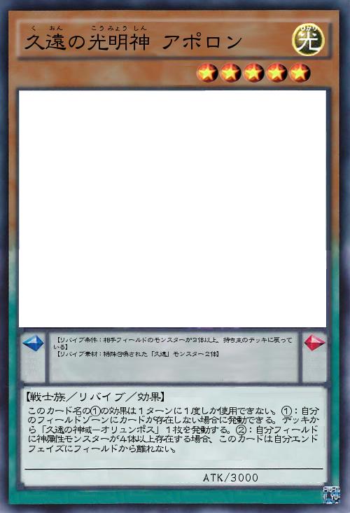 【全能神族/リバイブ/効果】 自分は「久遠の全能神 ゼウス」をデュエル中に1度しかリバイブ召喚できない。①:このカードが相手フィールドのモンスターを使用してリバイブ召喚に成功したターン、自分は直接攻撃できない。②:このカードがモンスターゾーンに存在する限り、相手フィールドの表側表示のカードの効果は無効化される。③:このカードは他のカードの効果を受けない。④:1ターンに1度、自分フィールド・墓地からこのカード以外の「久遠」モンスター5体とリバイブデッキから「久遠の全能神 ゼウス」1体を除外して発動できる。発動後4ターンの間、このカードはフィールドに残り続け、お互いのプレイヤーは使用していないメインモンスターゾーン及び魔法&罠ゾーンを使用できない。⑤:リバイブ召喚したこのカードがフィールドから離れた場合に発動する。除外されている自分の「久遠」モンスターを可能な限り特殊召喚する。 【リバイブ条件:表側表示で除外されている自分のリバイブモンスターが5体以上存在する】 【リバイブ素材:自分・相手フィールドのモンスター5体】 |