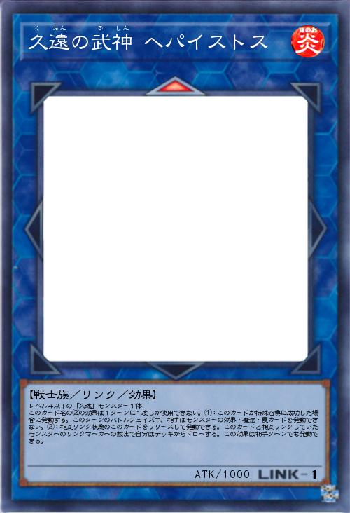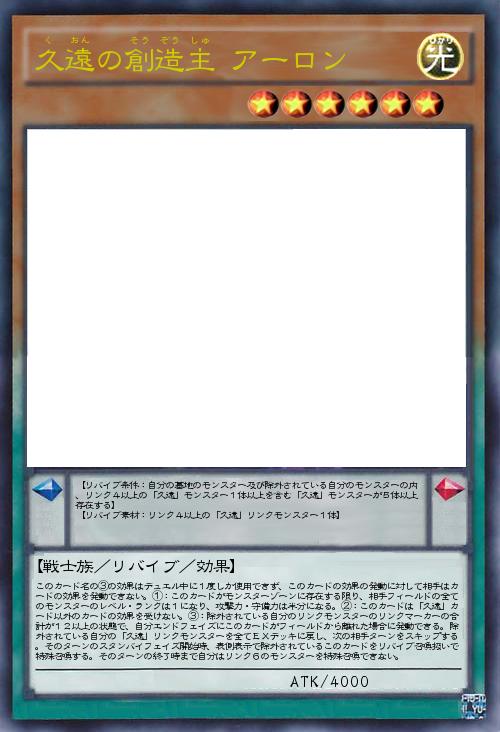【戦士族/リバイブ/効果】 このカード名の③の効果はデュエル中に1度しか使用できず、このカードの効果の発動に対して相手はカードの効果を発動できない。①:このカードがモンスターゾーンに存在する限り、相手フィールドの全てのモンスターのレベル・ランクは1になり、攻撃力・守備力は半分になる。②:このカードは「久遠」カード以外のカードの効果を受けない。③:除外されている自分のリンクモンスターのリンクマーカーの合計が12以上の状態で、自分エンドフェイズにこのカードがフィールドから離れた場合に発動できる。除外されている自分の「久遠」リンクモンスターを全てEXデッキに戻し、次の相手ターンをスキップする。そのターンのスタンバイフェイズ開始時、表側表示で除外されているこのカードをリバイブ召喚扱いで特殊召喚する。そのターンの終了時まで自分はリンク6のモンスターを特殊召喚できない。 【リバイブ条件:自分の墓地のモンスター及び除外されている自分のモンスターの内、リンク4以上の「久遠」モンスター1体以上を含む「久遠」モンスターが5体以上存在する】 【リバイブ素材:リンク4以上の「久遠」リンクモンスター1体】 |