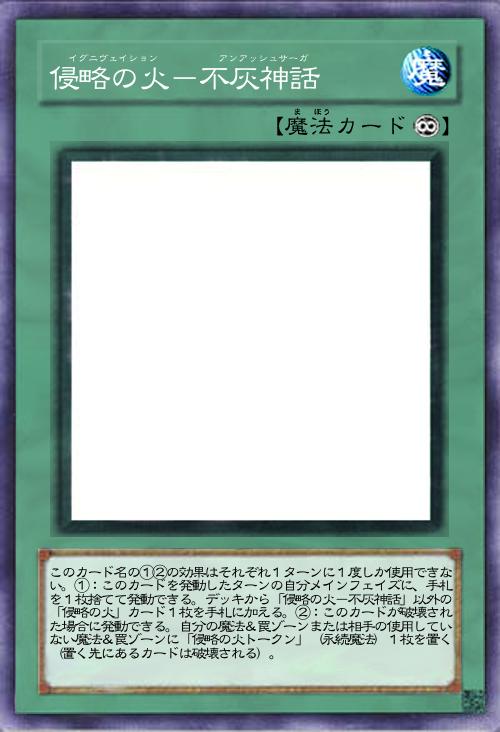 このカード名の①②の効果はそれぞれ1ターンに1度しか使用できない。①:このカードを発動したターンの自分メインフェイズに、手札を1枚捨てて発動できる。デッキから「侵略の火-不灰神話」以外の「侵略の火」カード1枚を手札に加える。②:このカードが破壊された場合に発動できる。自分の魔法&罠ゾーンまたは相手の使用していない魔法&罠ゾーンに「侵略の火トークン」(永続魔法)1枚を置く(置く先にあるカードは破壊される)。 |