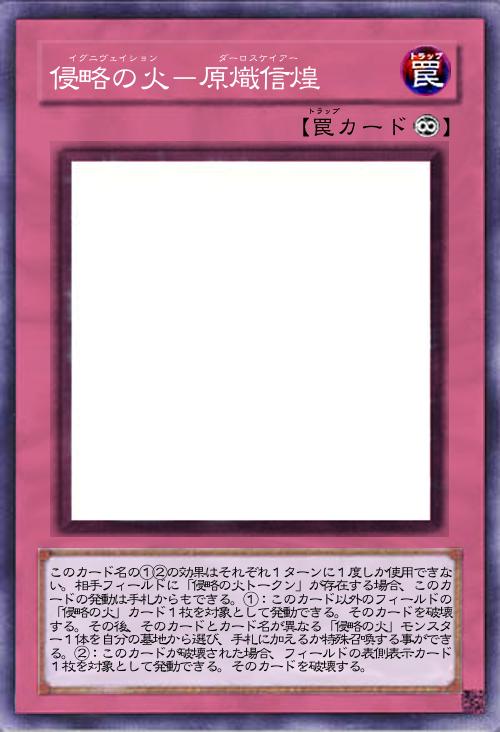 このカード名の①②の効果はそれぞれ1ターンに1度しか使用できない。相手フィールドに「侵略の火トークン」が存在する場合、このカードの発動は手札からもできる。①:このカード以外のフィールドの「侵略の火」カード1枚を対象として発動できる。そのカードを破壊する。その後、そのカードとカード名が異なる「侵略の火」モンスター1体を自分の墓地から選び、手札に加えるか特殊召喚する事ができる。②:このカードが破壊された場合、フィールドの表側表示カード1枚を対象として発動できる。そのカードを破壊する。 |