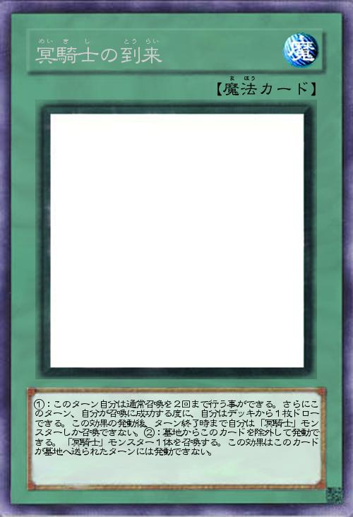 ①:このターン自分は通常召喚を2回まで行う事ができる。さらにこのターン、自分が召喚に成功する度に、自分はデッキから1枚ドローできる。この効果の発動後、ターン終了時まで自分は「冥騎士」モンスターしか召喚できない。②:墓地からこのカードを除外して発動できる。「冥騎士」モンスター1体を召喚する。この効果はこのカードが墓地へ送られたターンには発動できない。 |