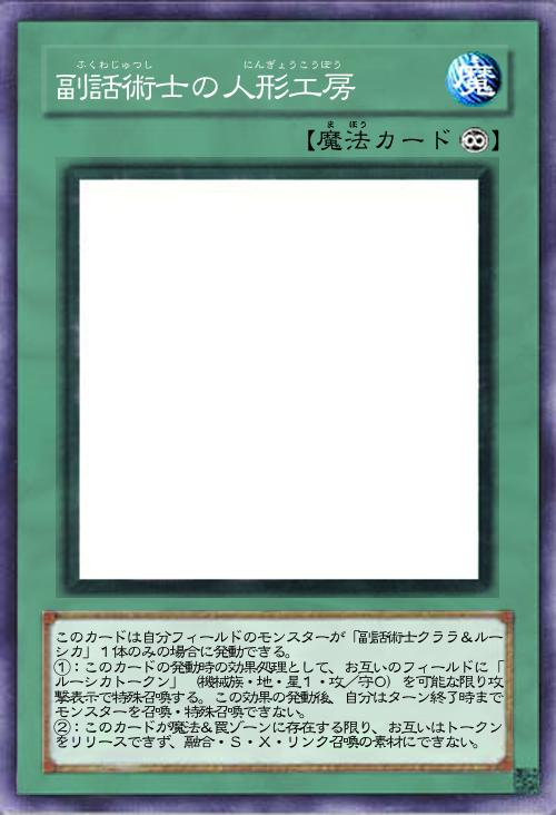 このカードは自分フィールドのモンスターが「副話術士クララ&ルーシカ」1体のみの場合に発動できる。 ①:このカードの発動時の効果処理として、お互いのフィールドに「ルーシカトークン」(機械族・地・星1・攻/守0)を可能な限り攻撃表示で特殊召喚する。この効果の発動後、自分はターン終了時までモンスターを召喚・特殊召喚できない。 ②:このカードが魔法&罠ゾーンに存在する限り、お互いはトークンをリリースできず、融合・S・X・リンク召喚の素材にできない。 |