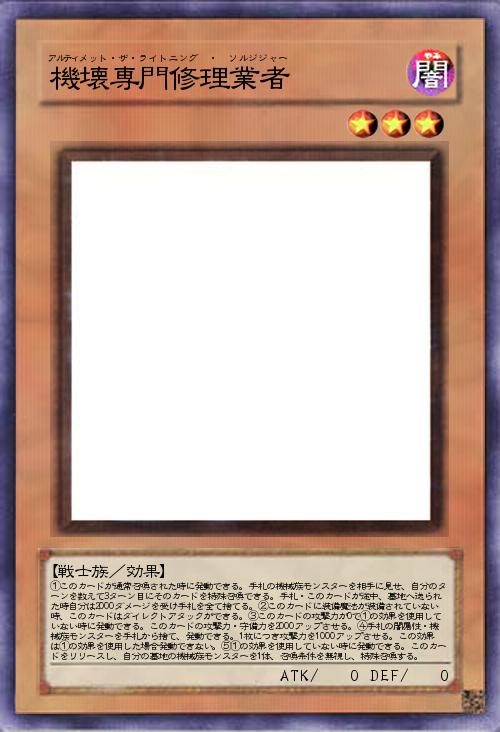 【戦士族/効果】 ①このカードが通常召喚された時に発動できる。手札の機械族モンスターを相手に見せ、自分のターンを数えて3ターン目にそのカードを特殊召喚できる。手札・このカードが途中、墓地へ送られた時自分は2000ダメージを受け手札を全て捨てる。②このカードに装備魔法が装備されていない時、このカードはダイレクトアタックができる。③このカードの攻撃力が0で①の効果を使用していない時に発動できる。このカードの攻撃力・守備力を2000アップさせる。④手札の闇属性・機械族モンスターを手札から捨て、発動できる。1枚につき攻撃力を1000アップさせる。この効果は①の効果を使用した場合発動できない。⑤①の効果を使用していない時に発動できる。このカードをリリースし、自分の墓地の機械族モンスターを1体、召喚条件を無視し、特殊召喚する。 |