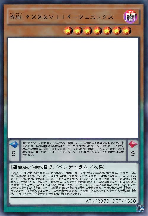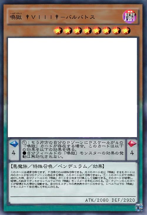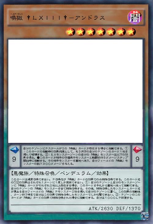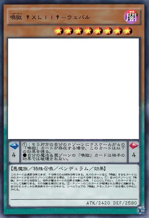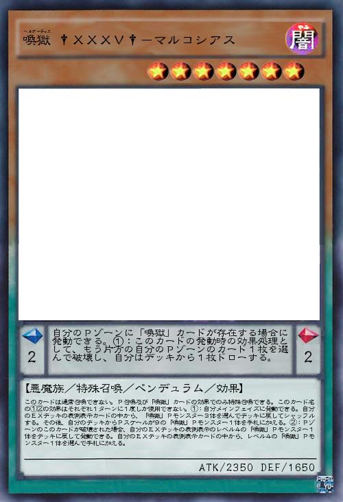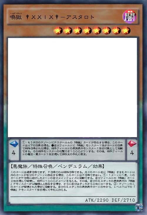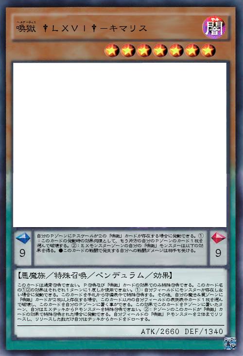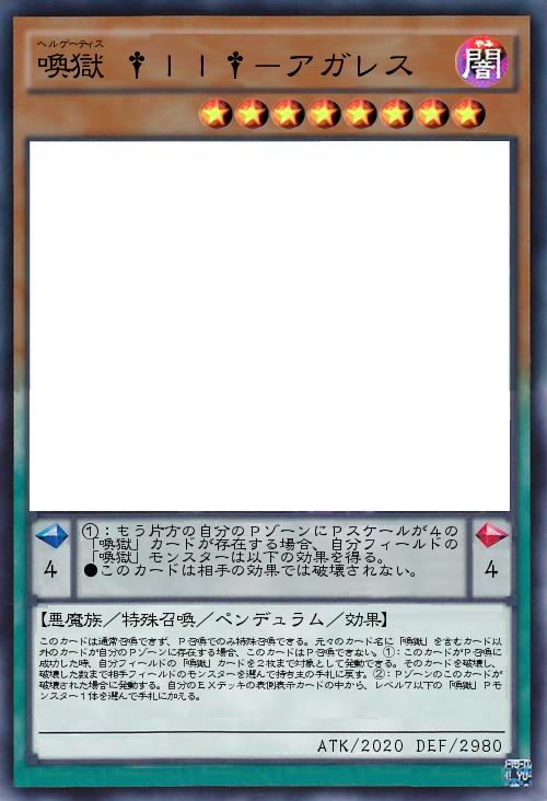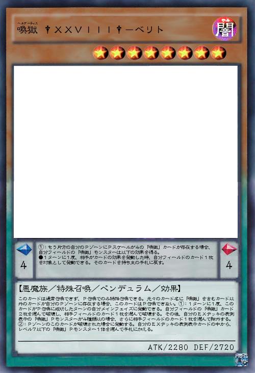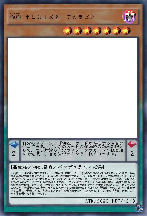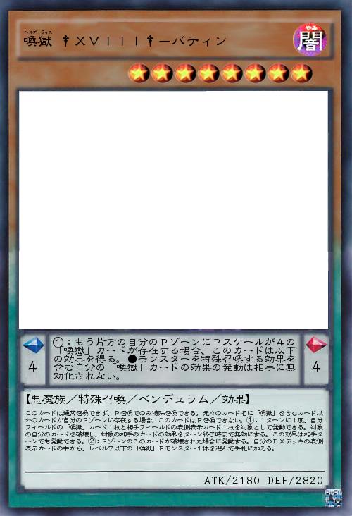 【悪魔族/特殊召喚/ペンデュラム/効果】 このカードは通常召喚できない。P召喚及び「喚獄」カードの効果でのみ特殊召喚できる。このカード名の①②の効果はそれぞれ1ターンに1度しか使用できない。①:自分のEXデッキの表側表示カードの中から、Pスケールが異なる「喚獄」Pモンスター2体を墓地へ送り、フィールドのセットされたカード1枚を対象として発動できる。そのカードを破壊する。破壊したカードが罠カードだった場合、さらに自分のPゾーンのカード1枚を選んで持ち主の手札に戻し、このカードを自分のPゾーンに置く事ができる。②:Pゾーンのこのカードが「喚獄」カードの効果で特殊召喚された場合に発動できる。相手フィールドの表側攻撃表示モンスター1体を選んで守備表示にする。この効果で表示形式を変更したモンスターの効果は無効化される。 自分のPゾーンにPスケールが2の「喚獄」カードが存在する場合に発動できる。①:このカードの発動時の効果処理として、もう片方の自分のPゾーンのカード1枚を選んで破壊する。②:EXモンスターゾーンの自分の「喚獄」モンスターは以下の効果を得る。●このカードが、このカードの攻撃力より高い攻撃力の相手モンスターと戦闘を行うダメージ計算時に1度、発動する。このカードの攻撃力はそのダメージ計算時のみ、1000アップする。 |