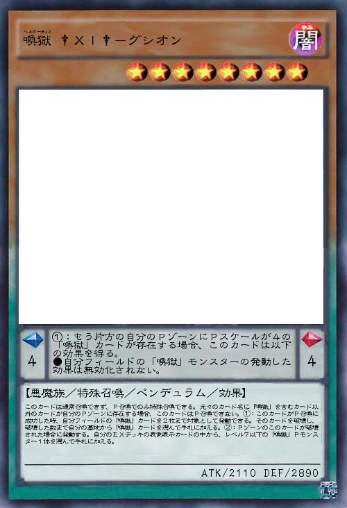 【悪魔族/特殊召喚/ペンデュラム/効果】 このカードは通常召喚できない。P召喚及び「喚獄」カードの効果でのみ特殊召喚できる。このカード名の①②の効果はそれぞれ1ターンに1度しか使用できない。①:自分メインフェイズに発動できる。自分のEXデッキの表側表示カードの中から、「喚獄」Pモンスター3体を選んでデッキに戻してシャッフルする。その後、自分のデッキからPスケールが9の「喚獄」Pモンスター1体を手札に加える。②:Pゾーンのこのカードが破壊された場合、自分のEXデッキの表側表示のレベル4の「喚獄」Pモンスター1体をデッキに戻して発動できる。自分のEXデッキの表側表示カードの中から、レベル4の「喚獄」Pモンスター1体を選んで手札に加える。 自分のPゾーンに「喚獄」カードが存在する場合に発動できる。①:このカードの発動時の効果処理として、もう片方の自分のPゾーンのカード1枚を選んで破壊し、自分はデッキから1枚ドローする。 |