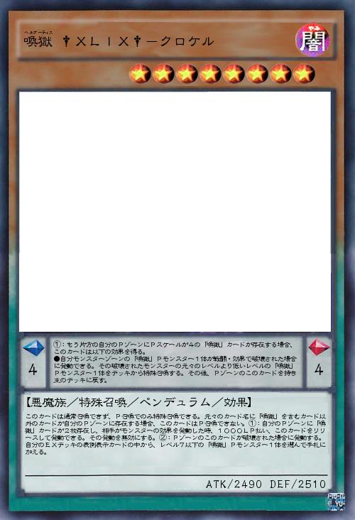 【悪魔族/特殊召喚/ペンデュラム/効果】 このカードは通常召喚できない。P召喚及び「喚獄」カードの効果でのみ特殊召喚できる。このカード名の①②の効果はそれぞれ1ターンに1度しか使用できない。①:手札からこのカードを相手に見せ、自分フィールドのレベル4の「喚獄」Pモンスター2体を対象として発動できる。そのモンスターを持ち主の手札に戻し、このカードを手札から特殊召喚する。その後、自分フィールドのモンスターがこのカードのみの場合、さらに手札からレベル7の「喚獄」Pモンスター1体を特殊召喚できる。②:Pゾーンのこのカードが破壊された場合、自分のEXデッキの表側表示のレベル4の「喚獄」Pモンスター1体をデッキに戻して発動できる。自分のEXデッキの表側表示カードの中から、レベル4の「喚獄」Pモンスター1体を選んで手札に加える。 自分のPゾーンに「喚獄」カードが存在する場合に発動できる。①:このカードの発動時の効果処理として、もう片方の自分のPゾーンのカード1枚を選んで破壊し、自分はデッキから1枚ドローする。 |