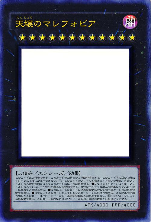 【天使族/エクシーズ/効果】 元々のレベルと異なるレベルを持つ同じレベルのモンスター×2体 このカード名の①②の効果はそれぞれ1ターンに1度しか使用できない。①:このカードがX召喚した時に発動する。EXデッキから「天壌のマレフォビア」1体をフィールド魔法カード扱いで自分のフィールドゾーンに表側表示で置く。②:相手がモンスターを召喚・特殊召喚した場合に発動できる。自分の墓地のXモンスター1体を特殊召喚する。この効果で特殊召喚したモンスターは効果を発動できず、攻撃できない。③:自分フィールドの魔法・罠カードが効果で破壊される場合、代わりにこのカードのX素材を1つ取り除く事ができる。 |