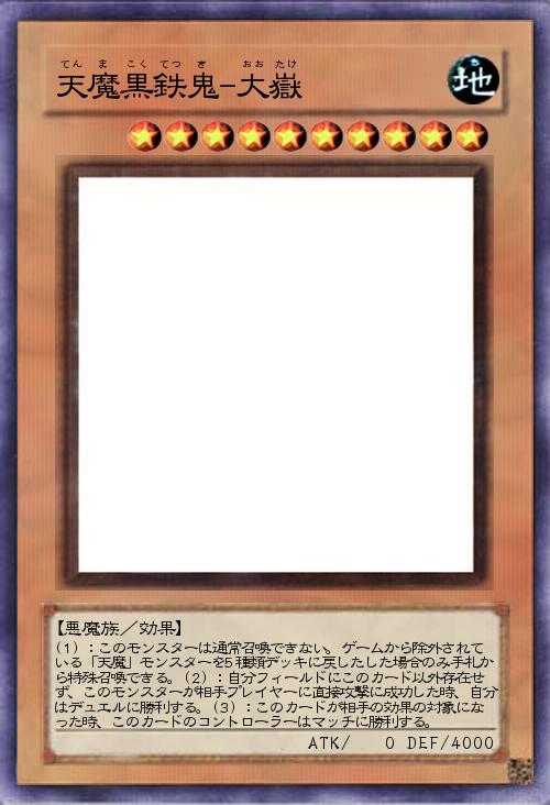 【悪魔族/効果】 (1):このモンスターは通常召喚できない。ゲームから除外されている「天魔」モンスターをすべてデッキに戻したした場合のみ手札から特殊召喚できる。(2):相手が攻撃力3000モンスターの効果が発動した時に発動できる。その効果を無効にし、相手フィールドのカードをすべて除外する。この効果で除外されたカードはこのデュエル中使用できない。(3):相手フィールドのカードが0枚の時、次の相手ターンをスキップする。(4):(3)の効果を3回以上使用したターンのエンドフェイズ時、自分はデュエルに勝利する。 |