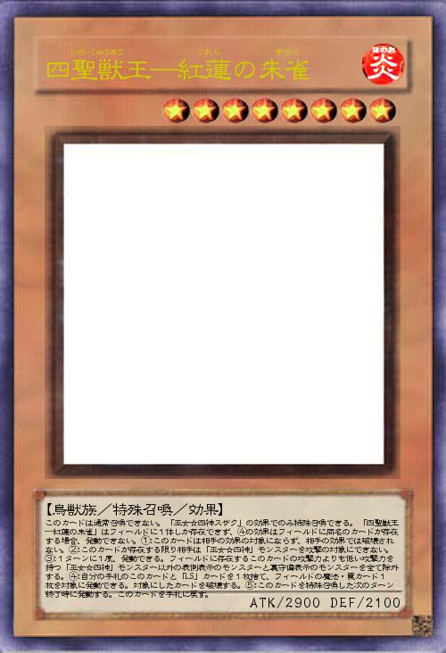 【鳥獣族/特殊召喚/効果】 このカードは通常召喚できない。「巫女☆四神スザク」の効果でのみ特殊召喚できる。「四聖獣王―紅蓮の朱雀」はフィールドに1体しか存在できず、④の効果はフィールドに同名のカードが存在する場合、発動できない。①:このカードは相手の効果の対象にならず、相手の効果では破壊されない。②:このカードが存在する限り相手は「巫女☆四神」モンスターを攻撃の対象にできない。③:1ターンに1度、発動できる。フィールドに存在するこのカードの攻撃力よりも低い攻撃力を持つ「巫女☆四神」モンスター以外の表側表示のモンスターと裏守備表示のモンスターを全て除外する。④:自分の手札のこのカードと「LS」カードを1枚捨て、フィールドの魔法・罠カード1枚を対象に発動できる。対象にしたカードを破壊する。⑤:このカードを特殊召喚した次のターン終了時に発動する。このカードを手札に戻す。 |