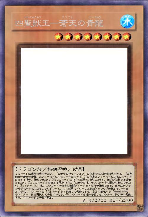 【ドラゴン族/特殊召喚/効果】 このカードは通常召喚できない。「巫女☆四神セイリュウ」の効果でのみ特殊召喚できる。「四聖獣王―蒼天の青龍」はフィールドに1体しか存在できず、④の効果はフィールドに同名のカードが存在する場合、発動できない。①:このカードは相手の効果の対象にならず、相手の効果では破壊されない。②:このカードが存在する限り相手は「巫女☆四神」モンスターを攻撃の対象にできない。③:1ターンに1度、このカードが相手に戦闘ダメージを与えた時発動できる。自分はデッキから手札が5枚になるようにドローし、この効果でドローした枚数×500LP回復する。④:自分の手札のこのカードと「LS」カードを1枚捨てて発動できる。自分の墓地から「巫女☆四神」モンスター1体を選択して手札に加える。⑤:このカードを特殊召喚した次のターン終了時に発動する。このカードを手札に戻す。 |
