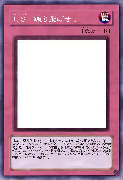 ①:自分が「巫女☆四神」モンスターを召喚するまたは「LS」魔法・罠カードを発動する度、このカードにライブカウンターを1個置く。自分フィールドに「巫女☆四神」モンスターが4種類存在する場合、ライブカウンターを置く数は2個になる。②:このカードに置かれているライブカウンターの数によって以下の効果を適用する。●2個以上:自分フィールドのこのカード及び「巫女☆四神」モンスターは1ターンに1度、カードの効果で破壊されない。●4個以上:「巫女☆四神」モンスターの効果及び「LS」魔法・罠カードの効果及び発動は無効にされない。●6個以上:1ターンに1度、このカードに置かれているライブカウンターを2個取り除くことで自分のデッキから1枚ドローする。●8個以上:相手はメインフェイズ2以外で攻撃力2000以上のモンスターを召喚・特殊召喚できない。●15個以上:15個取り除くことでこのカードのコントローラーはこのデ |