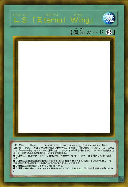 「LS「Eternal Wing」」は1ターンに1度しか使用できない。①:自分フィールドに「巫女☆四神」モンスターが存在する場合のみ発動できる。このカードの発動時、自分フィールドに存在する「巫女☆四神」モンスターの種類の数によって以下の効果を適用する。このカードを発動したターン、相手に与える戦闘ダメージは全て0になる。 ●3種類以下:自分のデッキ・手札・墓地から「巫女☆四神」モンスター1体を選択して特殊召喚する。 ●2種類以上:自分は自分の墓地に存在する「LS」魔法・罠カードの枚数×800LP回復し、その後相手に自分が回復した数値の半分の数値のダメージを与える。 ●3種類以上:自分はデッキから2枚ドローする。 ●4種類:相手の手札・フィールド・墓地のカードをそれぞれ2枚、合計3枚まで選んで除外する。 |
