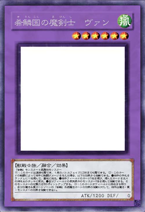 【獣戦士族/効果】 (1):このカードは直接攻撃できる。(2):このカードの戦闘によって相手に戦闘ダメージを与えた場合、以下の効果から発動できる。●:自分を1000LP回復する●:相手のデッキの上からカード3枚を墓地に送る。(3):このカードの召喚・特殊召喚に発動できる。自分のデッキから「融合」魔法カード・「フュージョン」魔法カード1枚を手札に加える。 |