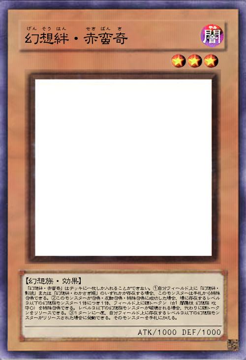 【幻想族・効果】 「幻想絆・赤蛮奇」はデッキに一枚しか入れることができない。①自分フィールド上に「幻想絆・影狼」または「幻想絆・わかさぎ姫」のいずれかが存在する場合、このモンスターは手札から特殊召喚できる。②このモンスターが召喚・反転召喚・特殊召喚に成功した場合、場に存在するレベル3以下の幻想族モンスター1体につき1体、フィールド上に頭トークン(☆1 闇属性 幻想族 攻守0)を特殊召喚できる。レベル3以下の幻想族モンスターが破壊される場合、代わりに頭トークンをリリースできる。③1ターンに一度、自分フィールド上に存在するレベル3以下の幻想族モンスターがリリースされた場合に発動できる。そのモンスターを手札に加える。 |