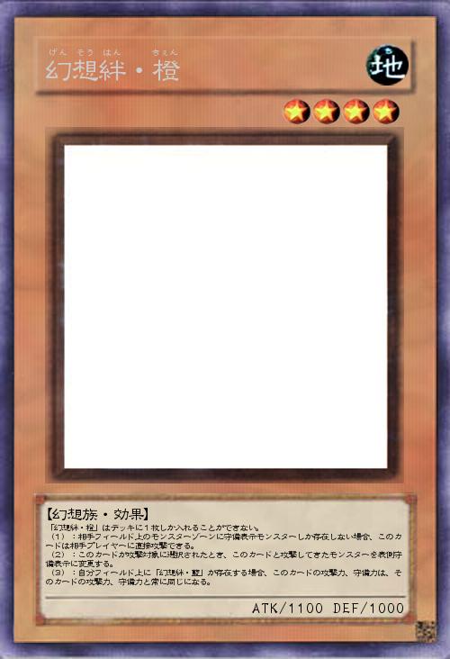 【幻想族・効果】 「幻想絆・橙」はデッキに1枚しか入れることができない。〇(1):相手フィールド上のモンスターゾーンに守備表示モンスターしか存在しない場合、このカードは相手プレイヤーに直接攻撃できる。〇(2):このカードが攻撃対象に選択されたとき、このカードと攻撃してきたモンスターを表側守備表示に変更する。〇(3):自分フィールド上に「幻想絆・藍」が存在する場合、このカードの攻撃力、守備力は、そのカードの攻撃力、守備力と常に同じになる。 |
