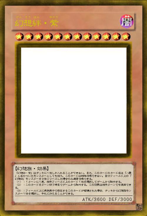【幻想族・効果】 「幻想絆・紫」はデッキに1枚しか入れることができない。また、このカードのカード名は「八雲」と名のついたモンスターとしても扱う。このカードは特殊召喚できない。自分フィールド上の「幻想絆」モンスターを3体リリースした場合のみ通常召喚できる。〇(1):1ターンに1度、相手フィールド上のカード1枚を選択してゲームから除外する。〇(2):このカードをターン終了時までゲームから除外する。この効果は相手ターンでも使用できる。〇(3):フィールド上に表側表示で存在するこのカードが破壊された場合、デッキから幻想族モンスター1体を選択し、手札に加えることができる。 |