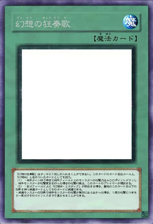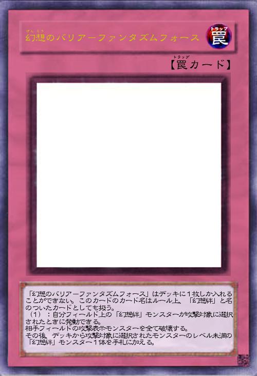 「幻想のバリア-ファンタズムフォース」はデッキに1枚しか入れることができない。このカードのカード名はルール上、「幻想絆」と名のついたカードとしても扱う。〇(1):自分フィールド上の「幻想絆」モンスターが攻撃対象に選択されたときに発動できる。〇相手フィールドの攻撃表示モンスターを全て破壊する。〇その後、デッキから攻撃対象に選択されたモンスターのレベル未満の「幻想絆」モンスター1体を手札に加える。 |