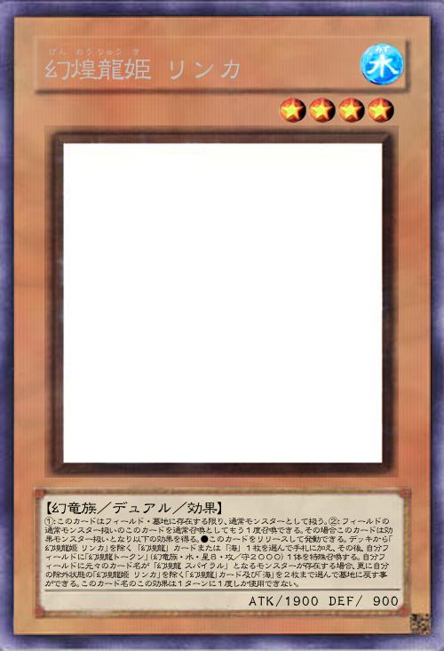【幻竜族/デュアル/効果】 ①:このカードはフィールド・墓地に存在する限り、通常モンスターとして扱う。②:フィールドの通常モンスター扱いのこのカードを通常召喚としてもう1度召喚できる。その場合このカードは効果モンスター扱いとなり以下の効果を得る。●このカードをリリースして発動できる。デッキから「幻煌龍姫 リンカ」を除く「幻煌龍」カードまたは「海」1枚を選んで手札に加え、その後、自分フィールドに「幻煌龍トークン」(幻竜族・水・星8・攻/守2000)1体を特殊召喚する。自分フィールドに元々のカード名が「幻煌龍 スパイラル」となるモンスターが存在する場合、更に自分の除外状態の「幻煌龍姫 リンカ」を除く「幻煌龍」カード及び「海」を2枚まで選んで墓地に戻す事ができる。このカード名のこの効果は1ターンに1度しか使用できない。 |