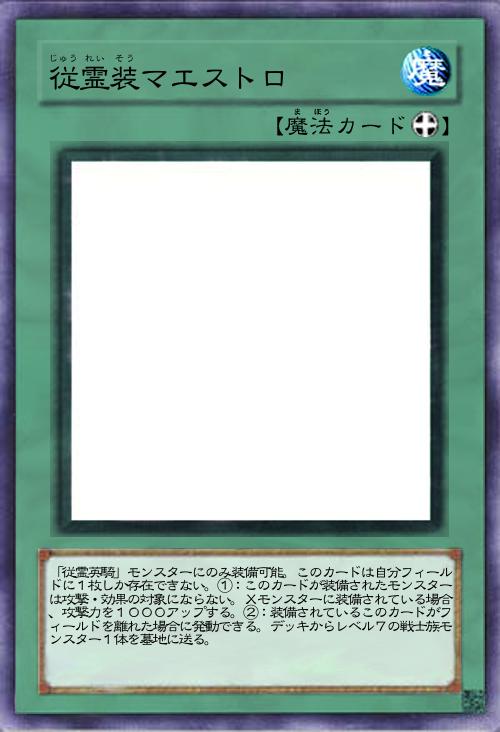 【戦士族/特殊召喚/効果】 このカード名の②③の効果はそれぞれ1ターンに1度しか使用できない。①:自分の墓地の装備魔法1枚と戦士族モンスター1体をデッキに戻して、手札・墓地から特殊召喚できる。②:このカードが特殊召喚した場合に発動できる。デッキから「従霊装マエストロ」1枚を手札に加える。③:このカードにカードが装備状態でX素材となった場合に発動できる。デッキの上から5枚を確認して「従霊装」と記されたカード全て墓地に送り、残りのカードはデッキに戻してシャッフルする。 |