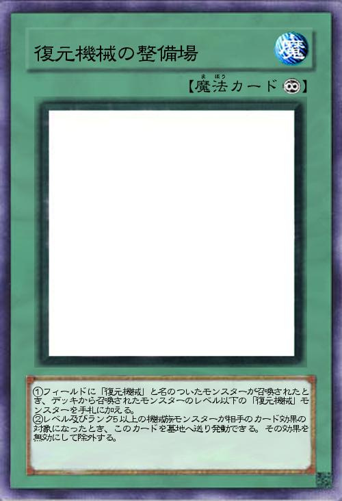 ①このカードが発動したとき、デッキから「復元機械」と名のついたカードを三枚選択し発動する。相手は選択したカードをランダムで一枚選択し、そのカードを自分の手札に加える。 ②フィールドの機械族モンスターが破壊されたときに発動できる。デッキから破壊されたモンスターより攻撃力の低い同レベル機械族モンスターを、召喚条件を無視して特殊召喚する。「復元機械の倉庫」のこの効果は1ターンに1度しか発動できない。 |