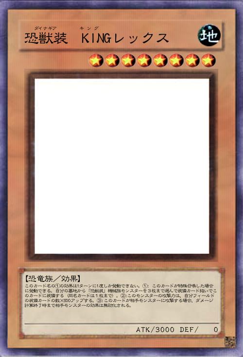 【恐竜族/効果】 このカード名の①の効果による特殊召喚は1ターンに1度しか行えず、②の効果は1ターンに1度しか発動できない。①:このカードは自分フィールドに、装備カードを装備した「恐獣装」モンスターが存在する場合、手札から特殊召喚できる。②:装備カードを装備したモンスターを含む自分フィールドの「恐獣装」モンスター2体をリリースして発動できる。デッキからレベル8の「恐獣装」モンスター1体を特殊召喚する。 |