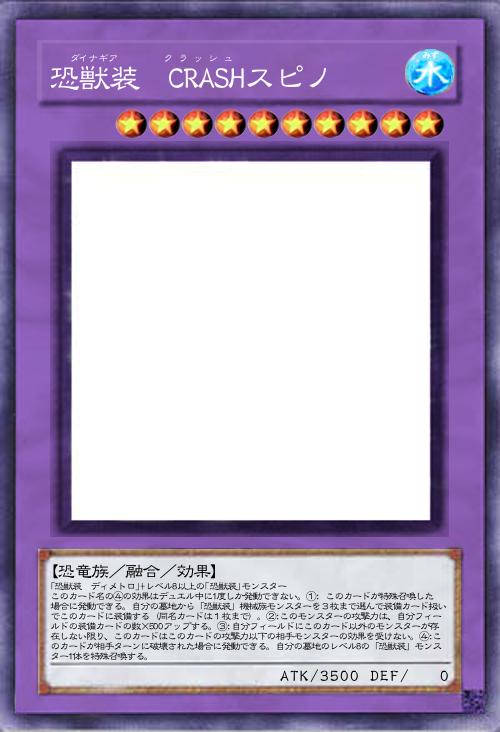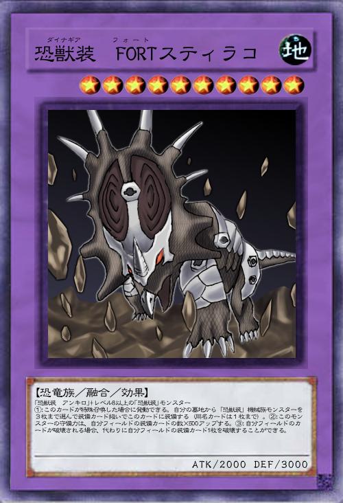 【恐竜族/融合/効果】 レベル4以下の「恐獣装」モンスター2体+レベル8以上の「恐獣装」モンスター このカード名の③の効果は1ターンに1度しか発動できない。①: このカードが特殊召喚した場合に発動できる。自分の墓地から「恐獣装」モンスターを4枚まで選んで装備カード扱いでこのカードに装備する(同名カードは1枚まで)。②:自分フィールドの「恐獣装」モンスターの攻撃力は、このカードに装備されている装備カードの数×500アップする。③:自分・相手ターンに1度、このカードに装備されている「恐獣装」モンスターカード1枚を対象として発動できる。そのモンスターを特殊召喚する。 |